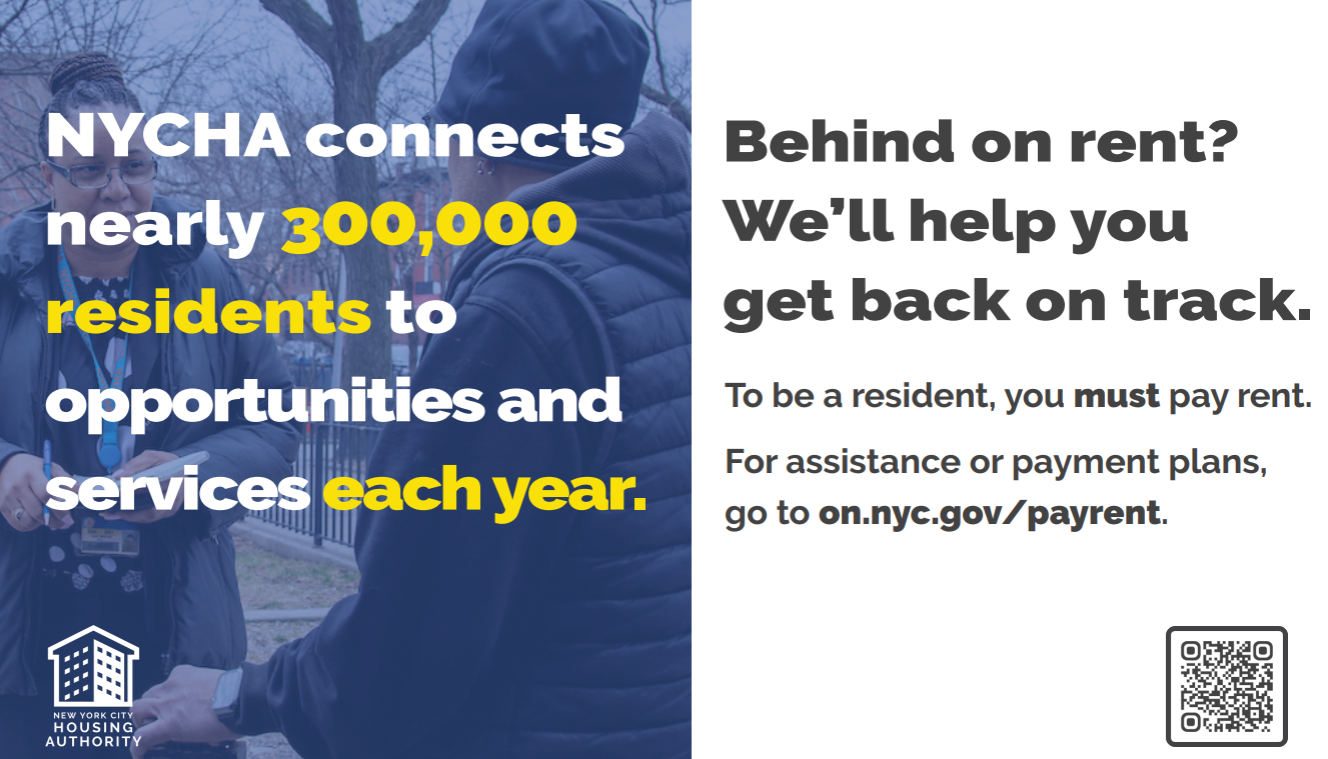 In the weeks ahead, you will see posters about this important issue in the common areas of developments and brochures in property management offices. As part of this awareness effort, NYCHA will also be reaching out to residents through calls and text messages to ensure that all of our public housing families have the information they need to pay their rent, address arrears, remain in good standing, and maintain housing stability.