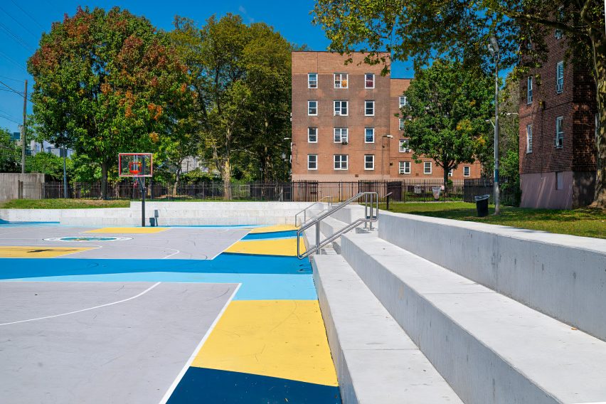 The cloudburst project at South Jamaica Houses features a sunken basketball court design to help reduce the impact of flash floods. (courtesy of Grain Collective)