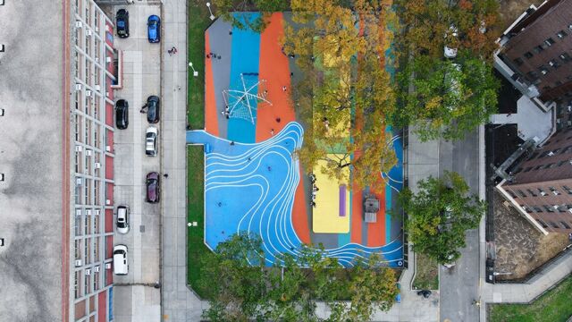 Additionally, Grain Collective was also honored with an ASLA Merit Award for its role in facilitating a resident-informed restoration of the playground at Alfred E. Smith Houses. In that role, the firm worked to gather significant feedback from residents on playground equipment, seating color preferences, and play area age ranges through several design charrettes. With that information, it helped oversee the construction of a multi-generational, two-way play space that accommodates the needs of children, young people, and seniors. The materials incorporated recycled plastic lumber that is non-toxic and long-lasting.