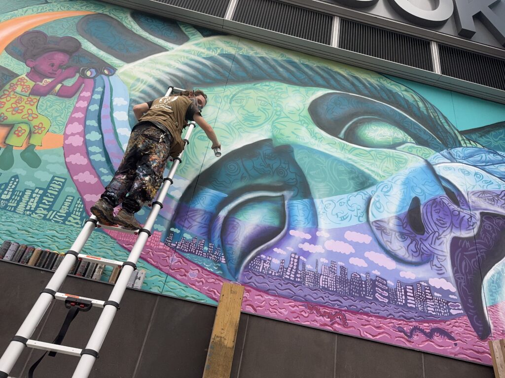 The mural’s imagery includes depictions of the Statue of Liberty, shooting stars, butterflies, and a young girl