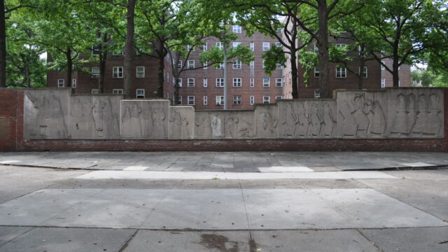 Since 1941, Kingsborough Houses has been the home of Exodus and Dance, an 8-foot by 80-foot sculpture that depicts scenes of Black people dancing and having a religious celebration. After almost 80 years on display outdoors at the development, the elements and time have taken their toll on the piece, and a restoration project will begin in 2021.