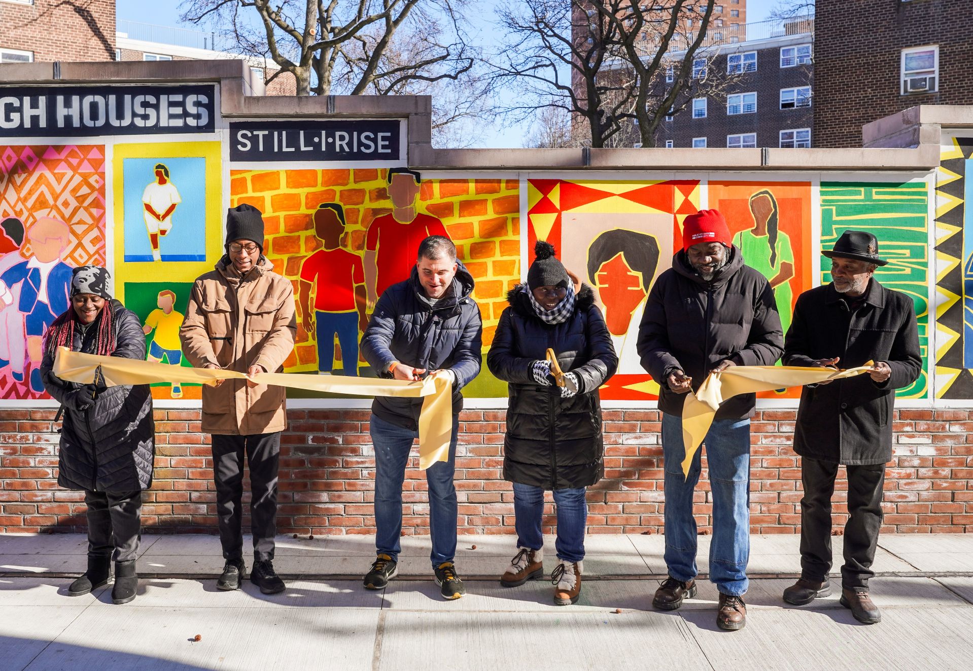 On January 20, the Public Housing Community Fund (PHCF), NYCHA, and local artists Gerard Pefung and Greg Roberson were joined by Kingsborough Houses residents to unveil From Weeksville to Kingsborough: Still We Rise, a new mural located on the backside of the recently restored Exodus and Dance frieze by Harlem Renaissance sculptor Richmond Barthé. The mural draws upon a shared appreciation for the Weeksville and Crown Heights historic neighborhoods and the enduring legacies of their residents. The mural was designed and created by lead artist Gerard Pefung, President of the Fulton Art Fair, and assistant artist Greg Roberson.