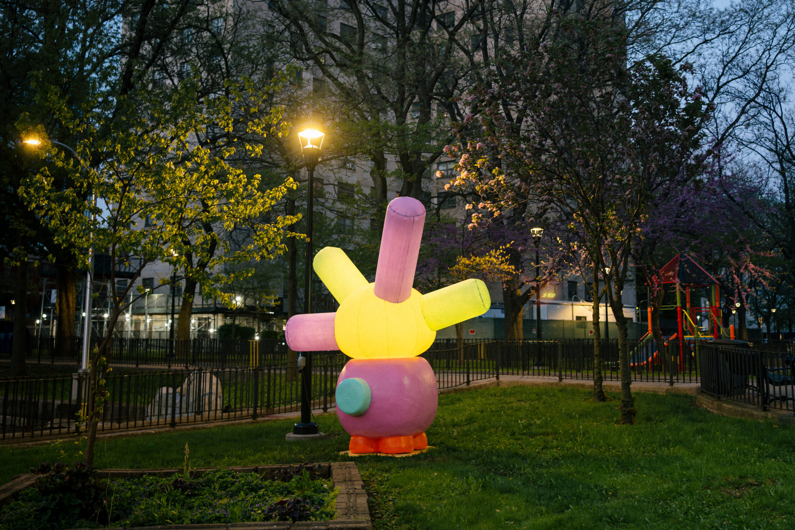 From now through August 2026, Wyckoff Gardens is one of three sites in Gowanus, Brooklyn, featuring Friends from the Canal, a public art installation of “cheerful mutant” sculptures produced by the Van Alen Institute. The colorful creatures that light up at night are inspired by life in the Gowanus Canal – and they imagine what might emerge from the canal waters to explore the neighborhood.